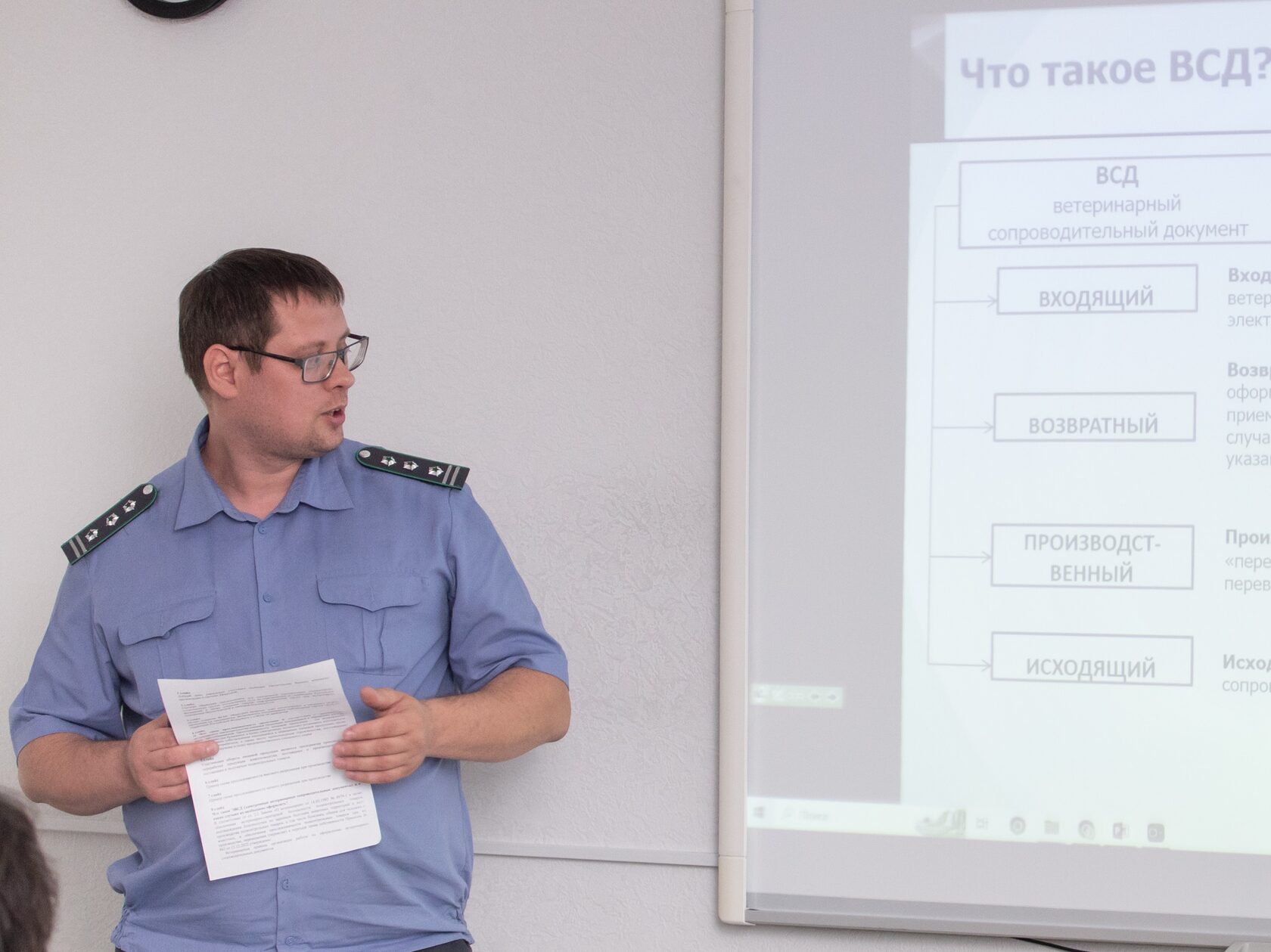 В первой блоке семинара с теоретической частью и ответами на вопросы выступил заместитель начальника отдела пограничного ветеринарного контроля на государственной границе РФ и транспорте Управления Россельхознадзора по Тюменской области, Ямало-Ненецкому и Ханты-Мансийскому автономным округам - референт государственной службы I класса Александр Владимирович Панин.